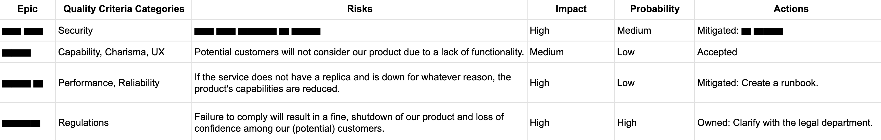 We had risks in all categories. Removing certain epics would reduce the capabilities, charisma and usability of our service. Others would affect security, reliability and performance. By thinking through these potential risks, we also identified unknowns that we needed to clarify. This was particularly important for epics related to regulations.